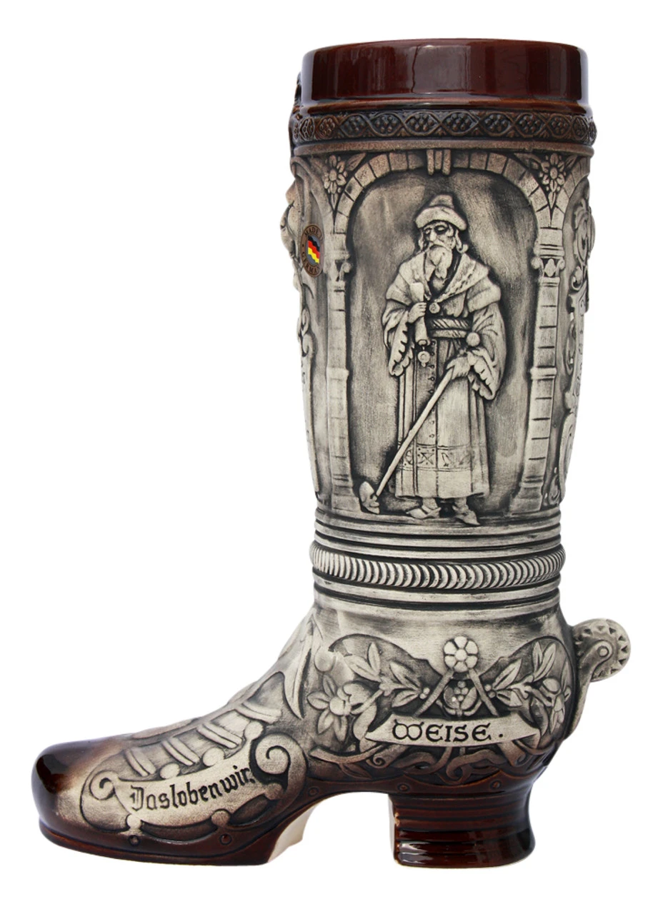 This German made 2 liter ceramic beer boot was originally modeled in the 1920s when the tradition of drinking out of a boot became known (see history below). One side depicts a soldier with helmet in hand and the text “TAPFER.” “Froh beim Bier.” which translates as: “BRAVE.” “Happy with beer.” The reverse side shows a wise man with scroll and walking stick pointed at a skull as if to say “leave me alone death”. The text reads: “WEISE.” “Das loben wir.” which translates as: “WISE.” “That’s what we like.”