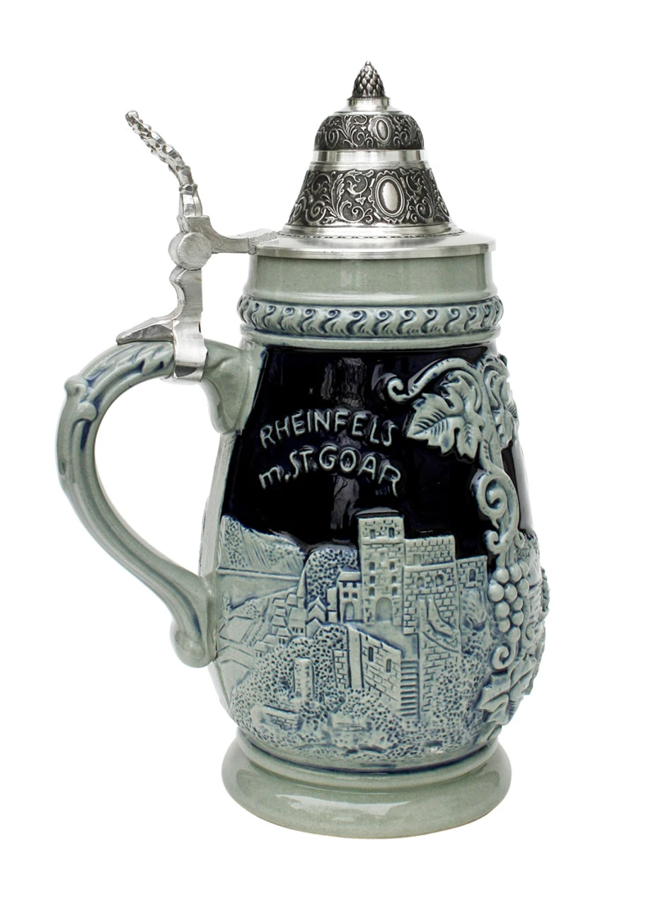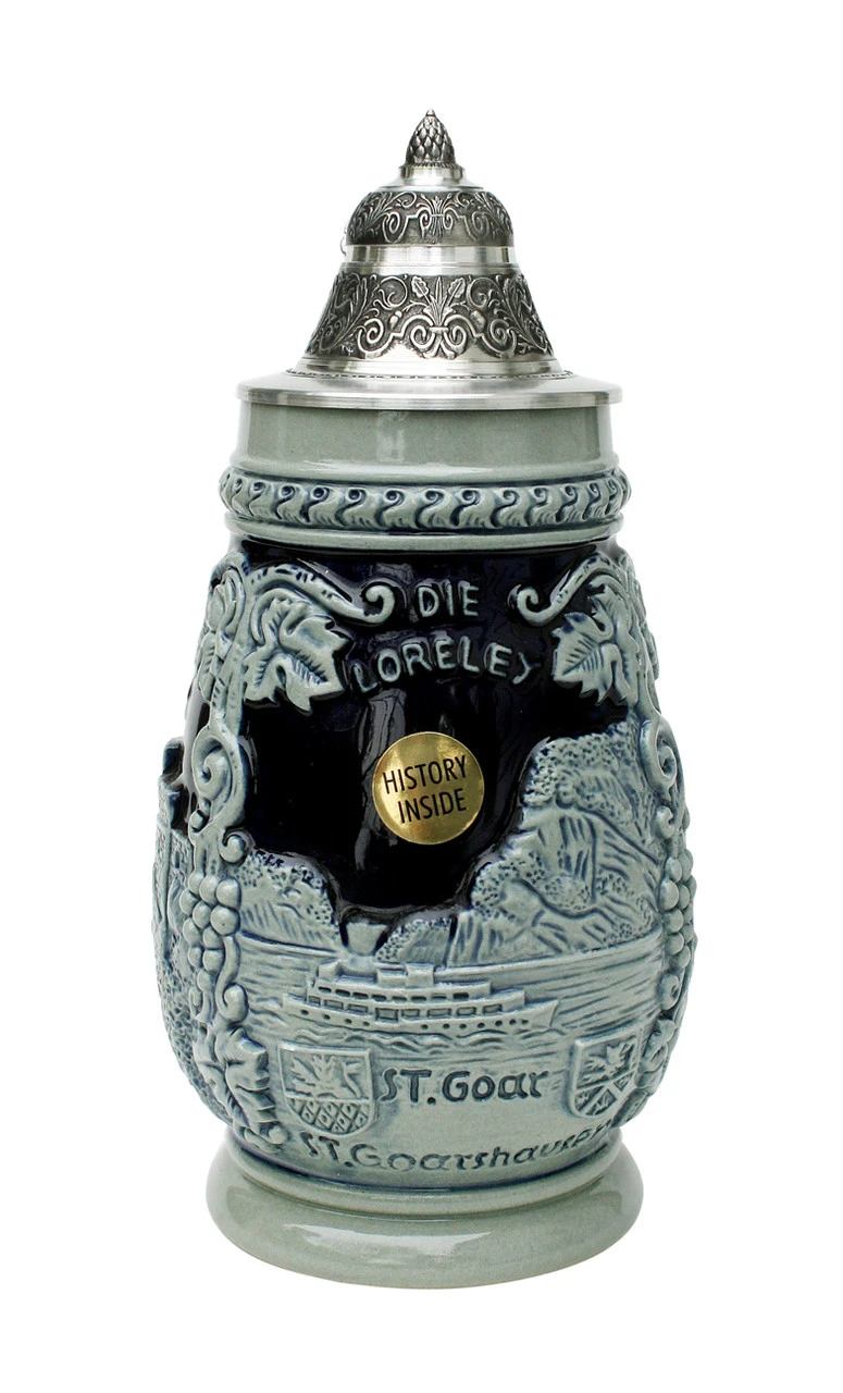 This cobalt blue stein pays tribute to the legend of Loreley, as well as, the village of St. Goar and St. Goarshausen. Lorelei, a maiden or mermaid that sits atop a rock overlooking the Rhine River’s narrowest water passageway, entrances the passing boatmen with her beautiful song, causing them to fall negligent in the duties of navigating their boat through the treacherous waters.