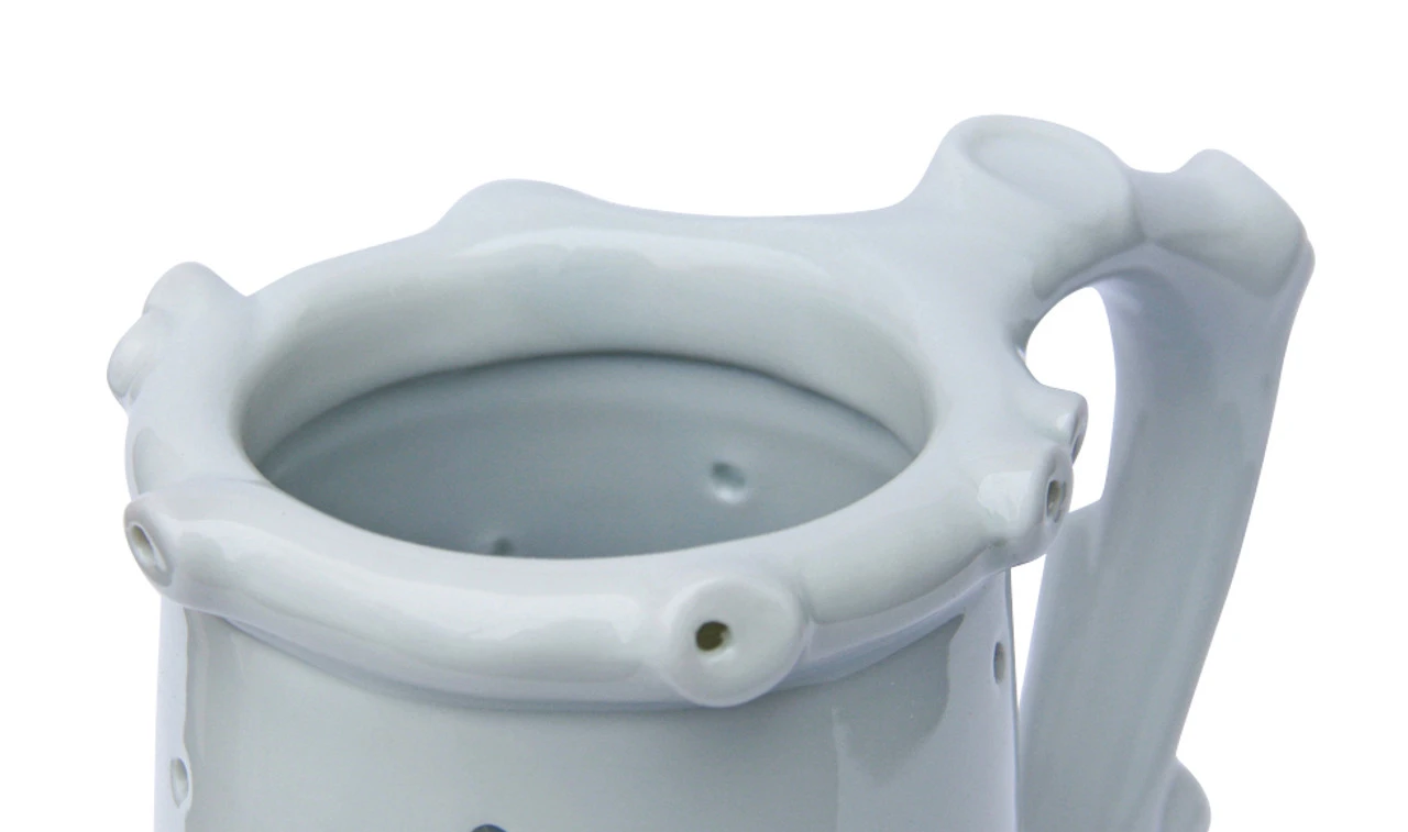 A series of holes pass through the top half of the stein body and the along the lip rim and handle. Instructions included. Beautifully crafted decorative handle and mouth in a tree branch pattern.